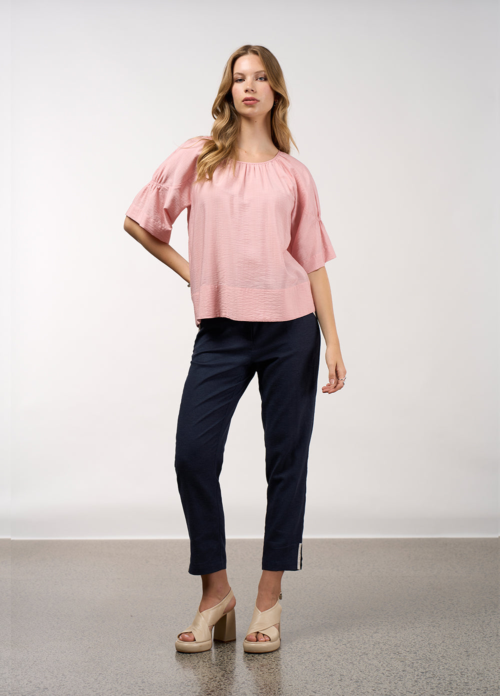 Tapered pant featuring contrast herringbone tape detail at the front pocket and at the front hem, with an elasticated back waist panel with darts for a perfect fit.