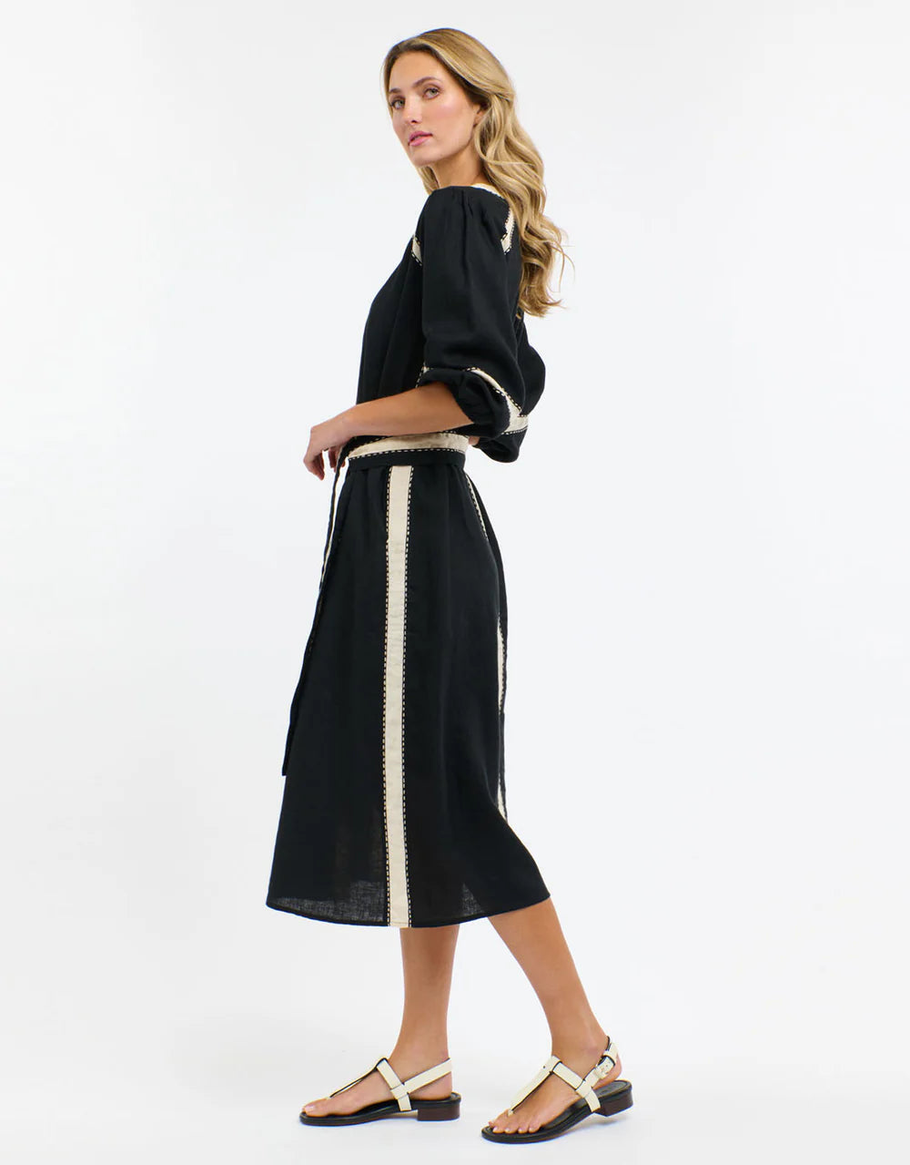 Bring a touch of relaxed elegance to your summer wardrobe with the Carolyn Resort Dress in Natural/Black by 365 Days.  Crafted in a lightweight, breathable fabric, this dress features striking contrast black trims that frame the body beautifully, while the tie-waist belt adds effortless definition. With its soft balloon sleeves and ankle-grazing length, it’s the kind of style that transitions easily from beach days to balmy evening dinners.