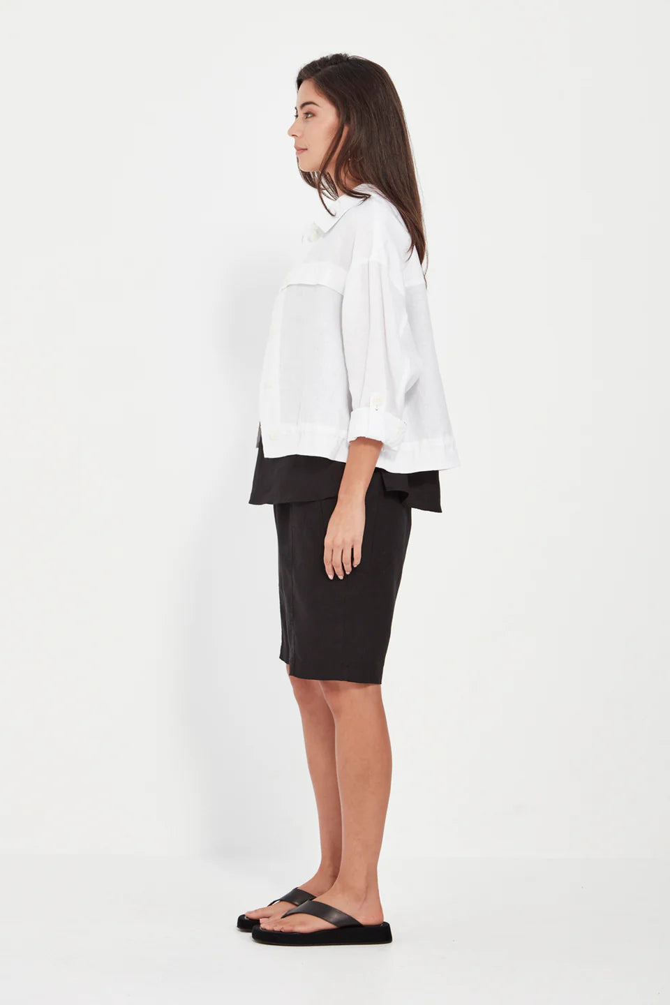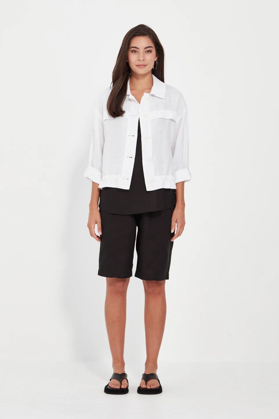 The Echo Jacket is a relaxed-fit utility style crafted from 100% linen. It features a button front, classic collar, and full-length sleeves that can be rolled to the elbow with a button tab. An internal drawcord allows you to cinch the waist for shape. Lightweight and versatile, it pairs perfectly with pants or works as an easy summer layer over dresses.