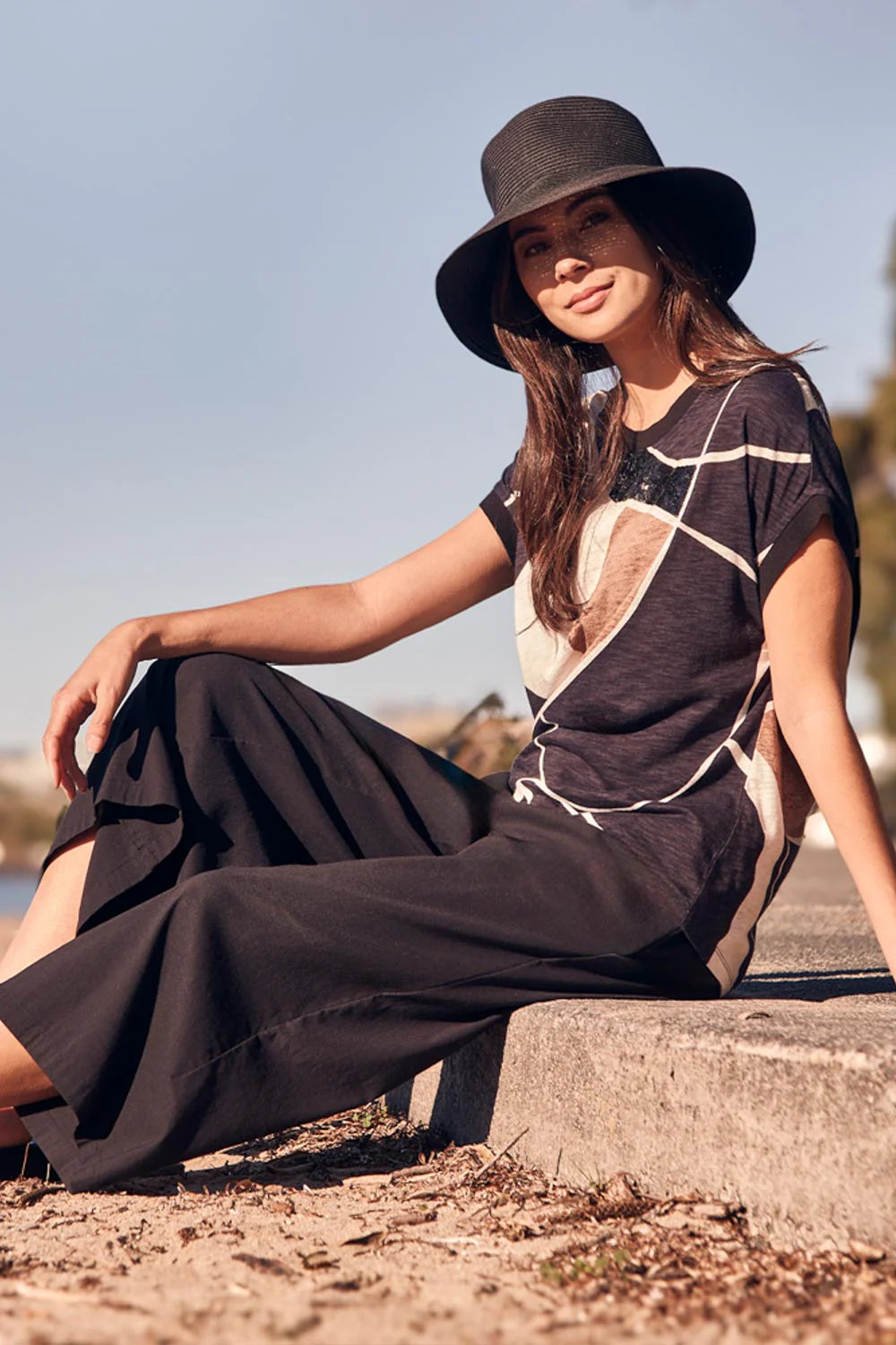 This printed top combines cotton and modal for a soft, comfortable feel, featuring extended shoulder sleeves for a modern silhouette. It has a rounded neckline and sleeves finished with black ribbed trim. A sequin detail at the front adds subtle shine. The Genesis top is designed to sit at hip length, offering a flattering fit.