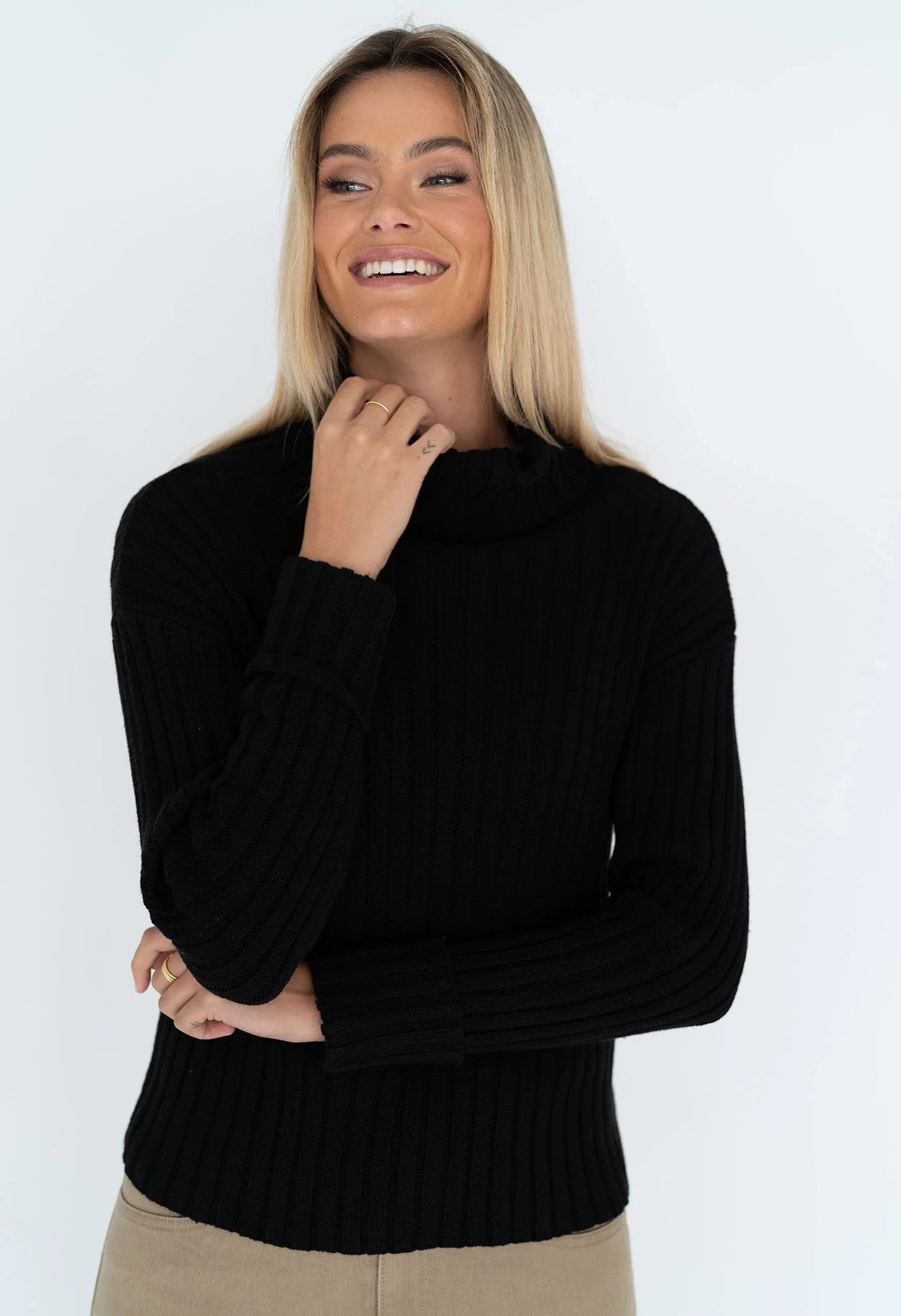 The rib knit will relax (flatten slightly) with wear but will bounce back a little when you wash. The high neck is designed to keep you toasty, as mum always says ‘If your neck is warm - you're warm’.