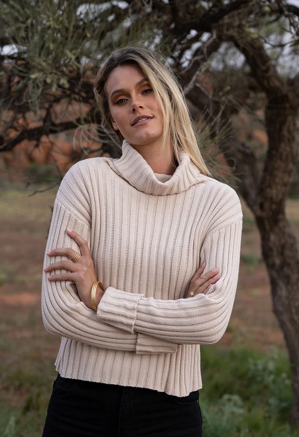 Available in three warm neutral winter tones. This cotton/acrylic blend is perfect for Aussie winters and we love a jumper that has that raw natural fibre look to it. This is a blended knit but it looks like 100% cotton. The acrylic stabilizes the knit and makes it last longer, which is why we blend. This soft blend breathes beautifully, keeping your temperature at a nice level of cosy.