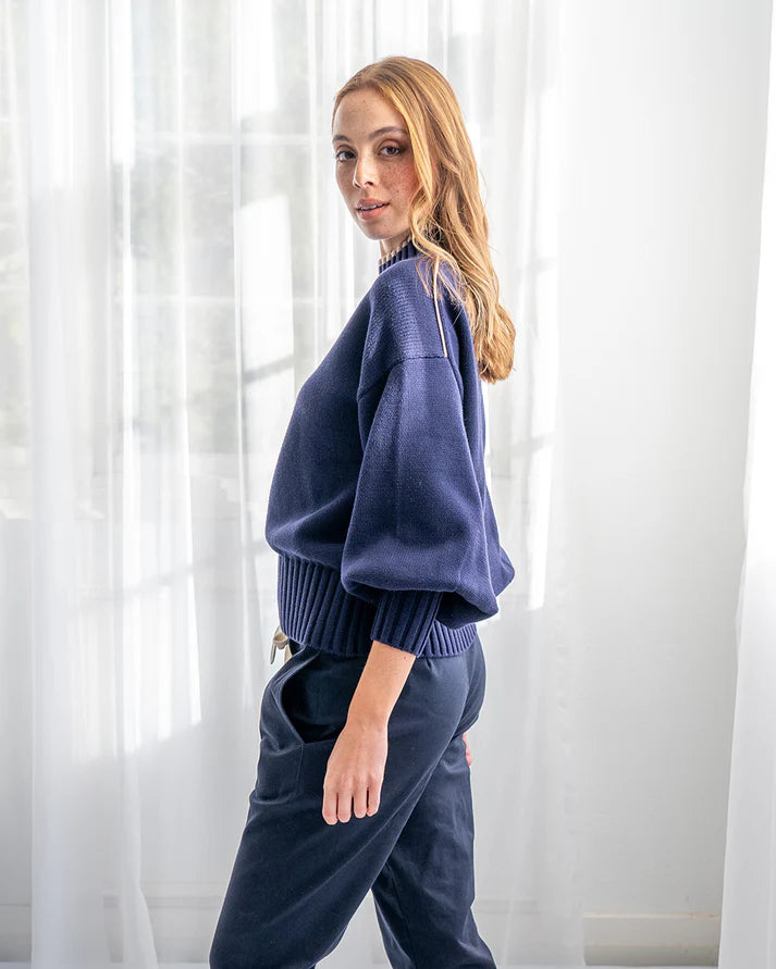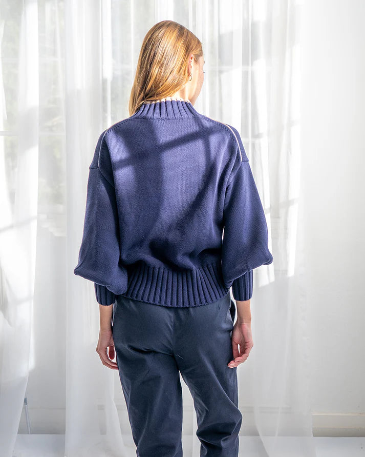 Snuggle up as the weather cools down with the Montilla Knit by Elms+King. A heavier gauge 100% cotton knit, featuring a blouson sleeve with a ribbed cuff and hem band and a contrast accent on the ribbed neck and shoulder.