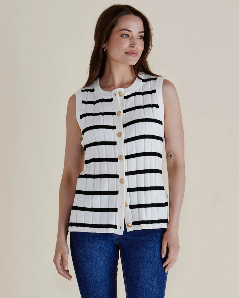 Sleek and versatile, the Nicollete Knit Vest is a sophisticated layering piece for the cooler months. With a crew neckline, button-through front, and wide rib detailing, it adds a refined texture to any outfit. Designed in a relaxed fit, it pairs effortlessly over shirts or under coats. A polished addition to your transeasonal wardrobe.