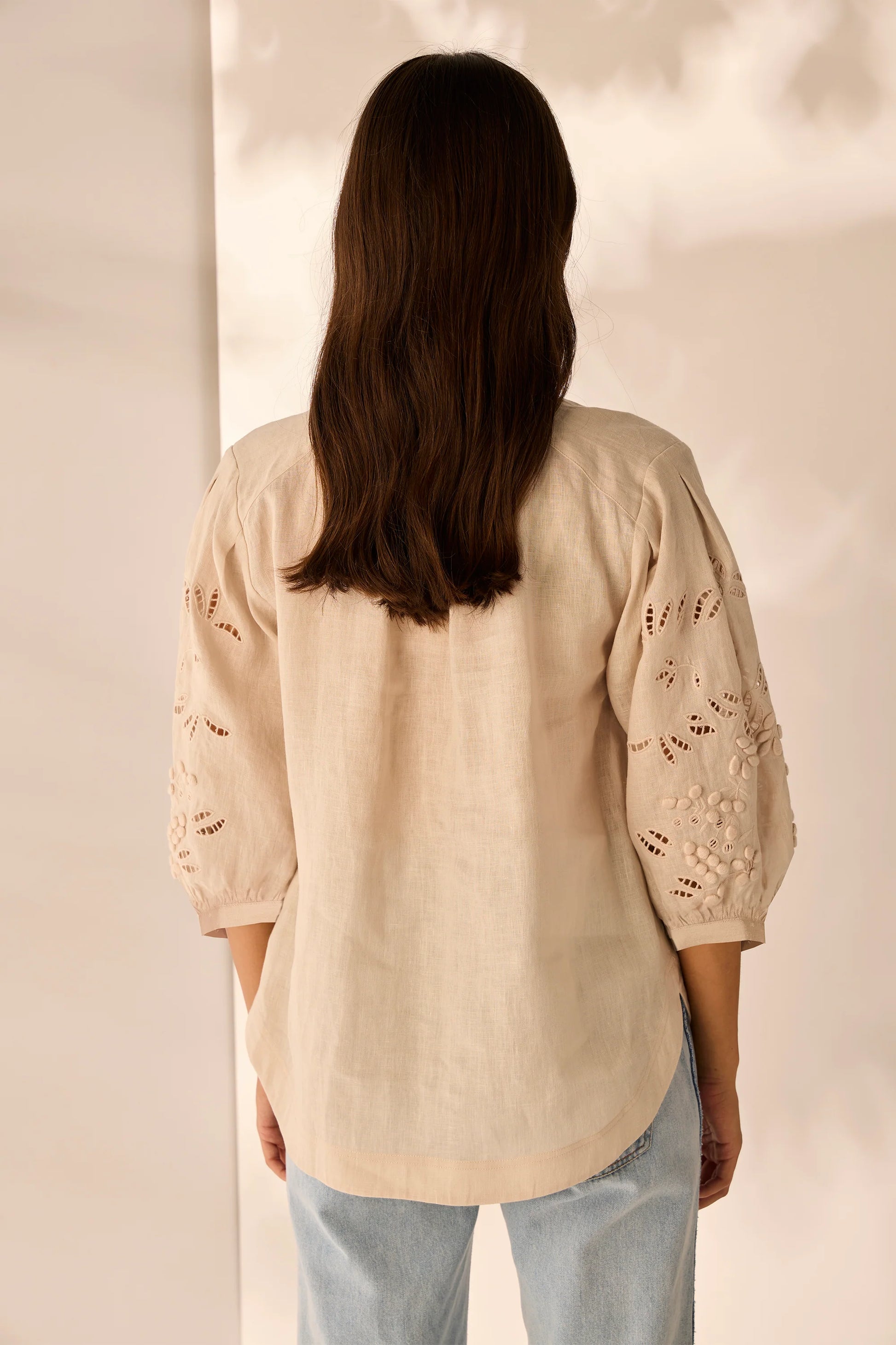 The Steffi Shirt celebrates spring-ready versatility with feminine embroidery on sleeves and neckline, a central placket featuring self-covered buttons with metal accents, and a delicate collar stand. Ideal for both work and leisure, it adds sophistication to any outfit. Pair it effortlessly with jeans or linen pants for a polished, stylish ensemble.